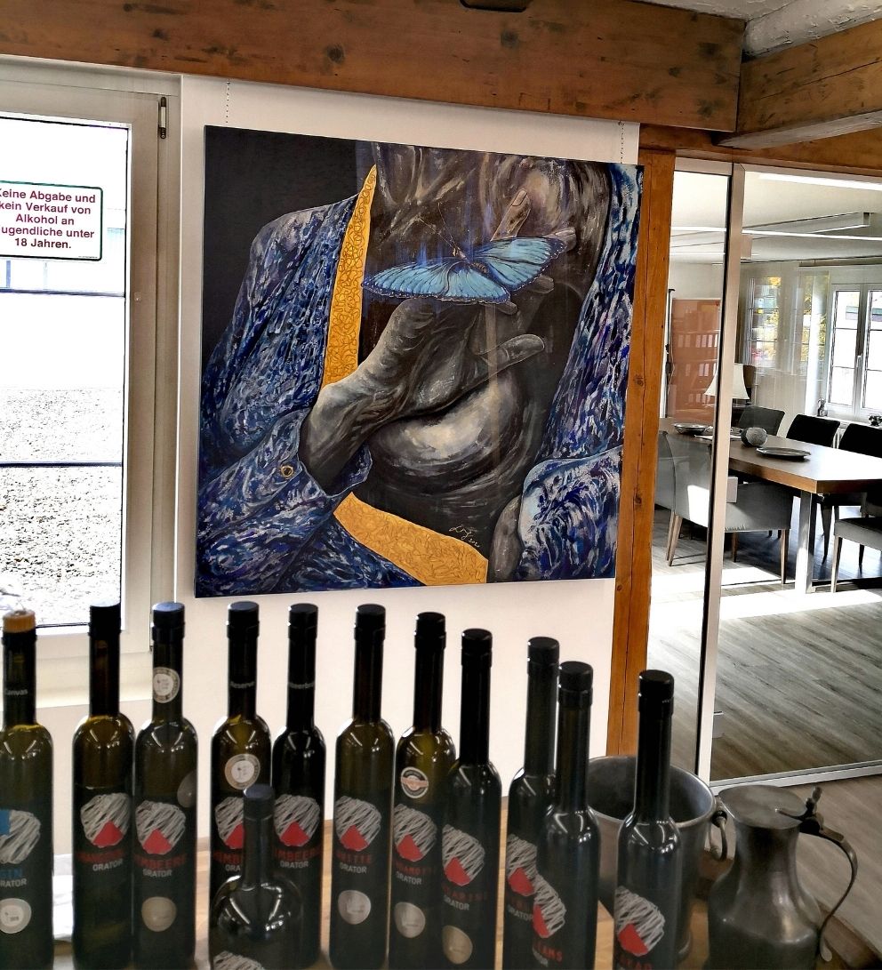 The gold border is made of real thread spool and then coated with 2 different gold colours, a very unique and delicate but very accentuated part of the painting. With this, I paid tribute to the historic renovated building of the gin manufacturer ORATOR AG in Switzerland (one of their gin products is also called Blue Velvet), which was operated as a thread and yarn factory for decades in the past.