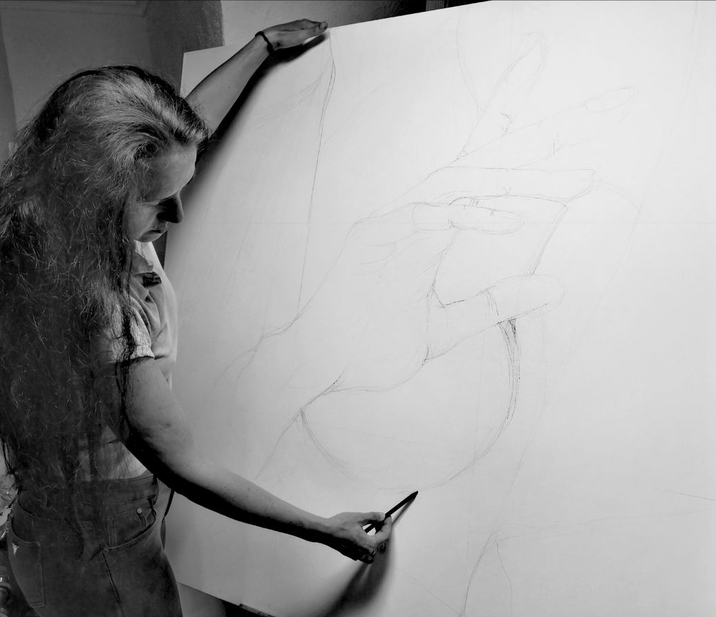The morpho-butterfly was given additional lighting, hovering in golden dust from above, and this beam of light, directed only at it, enhanced its already sparkling blue. Between its wings, a wand of light makes its way to the wrist of the female figure leaning against the left side of its body. The wings reflect part of the neon blue light “falling” on them from above, which can only be seen from one side of the painting, while from the other side it is completely invisible to the viewer. This effect is achieved with a very special acrylic crystal paint (manufactured by Lascaux Colours & Restauro, Brüttisellen, CH-8306).